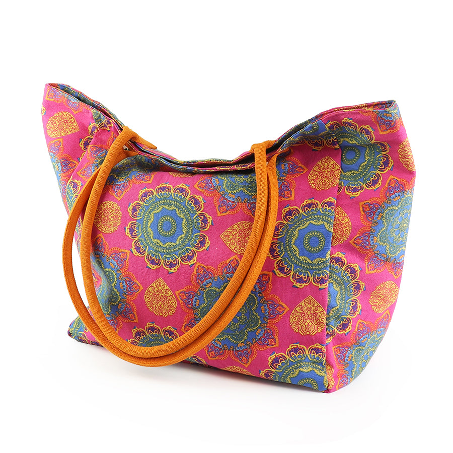 Carry summer wherever you go with this vibrant cotton beach bag. Designed with a striking pink, blue and mustard mandala print and finished with bright orange handles, this roomy boho-inspired holdall is perfect for beach days, festivals and everyday summer outings.