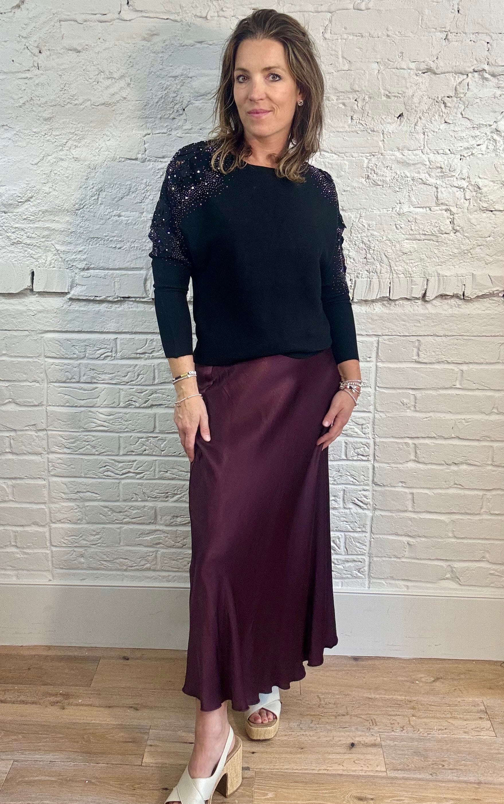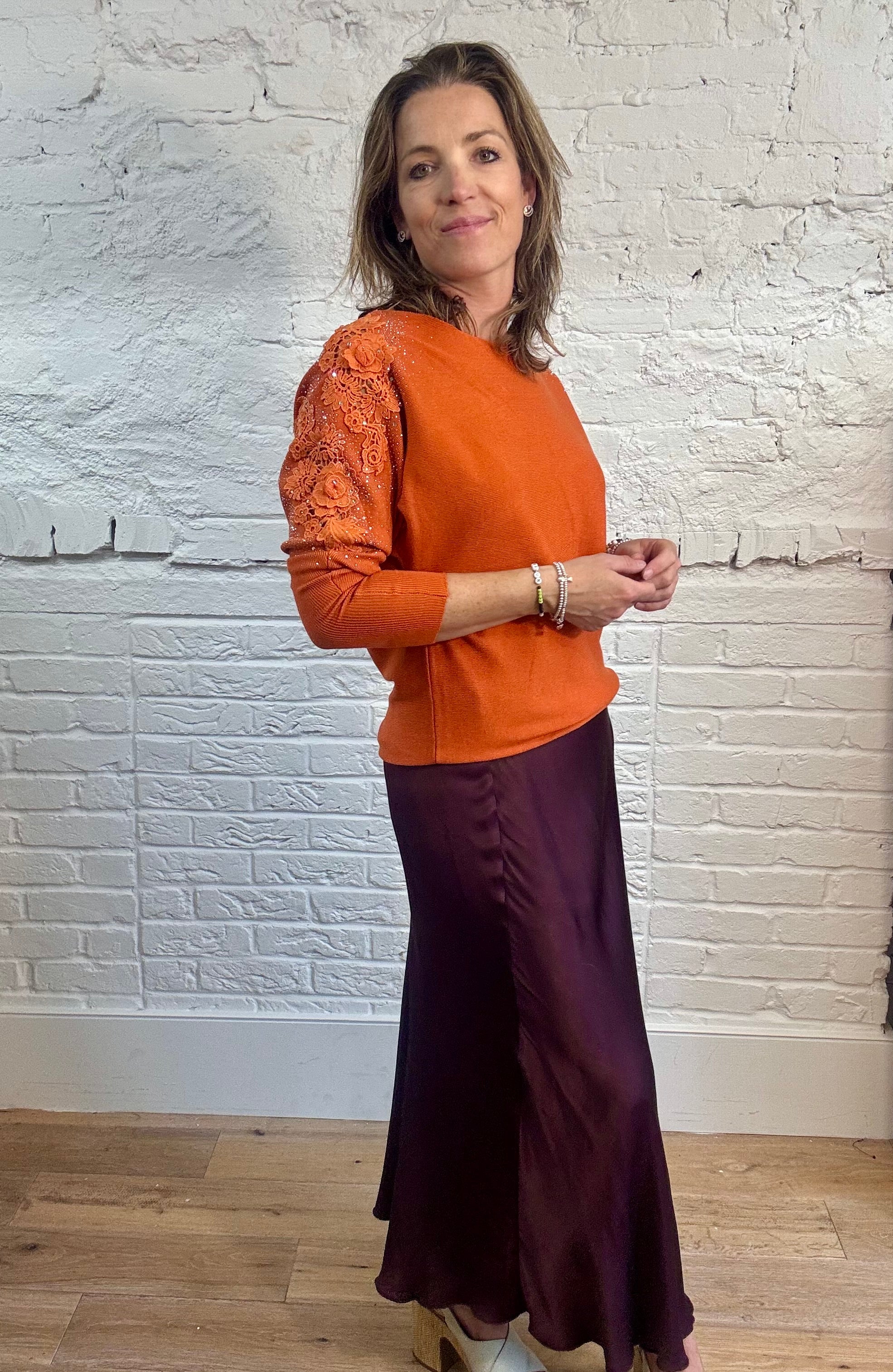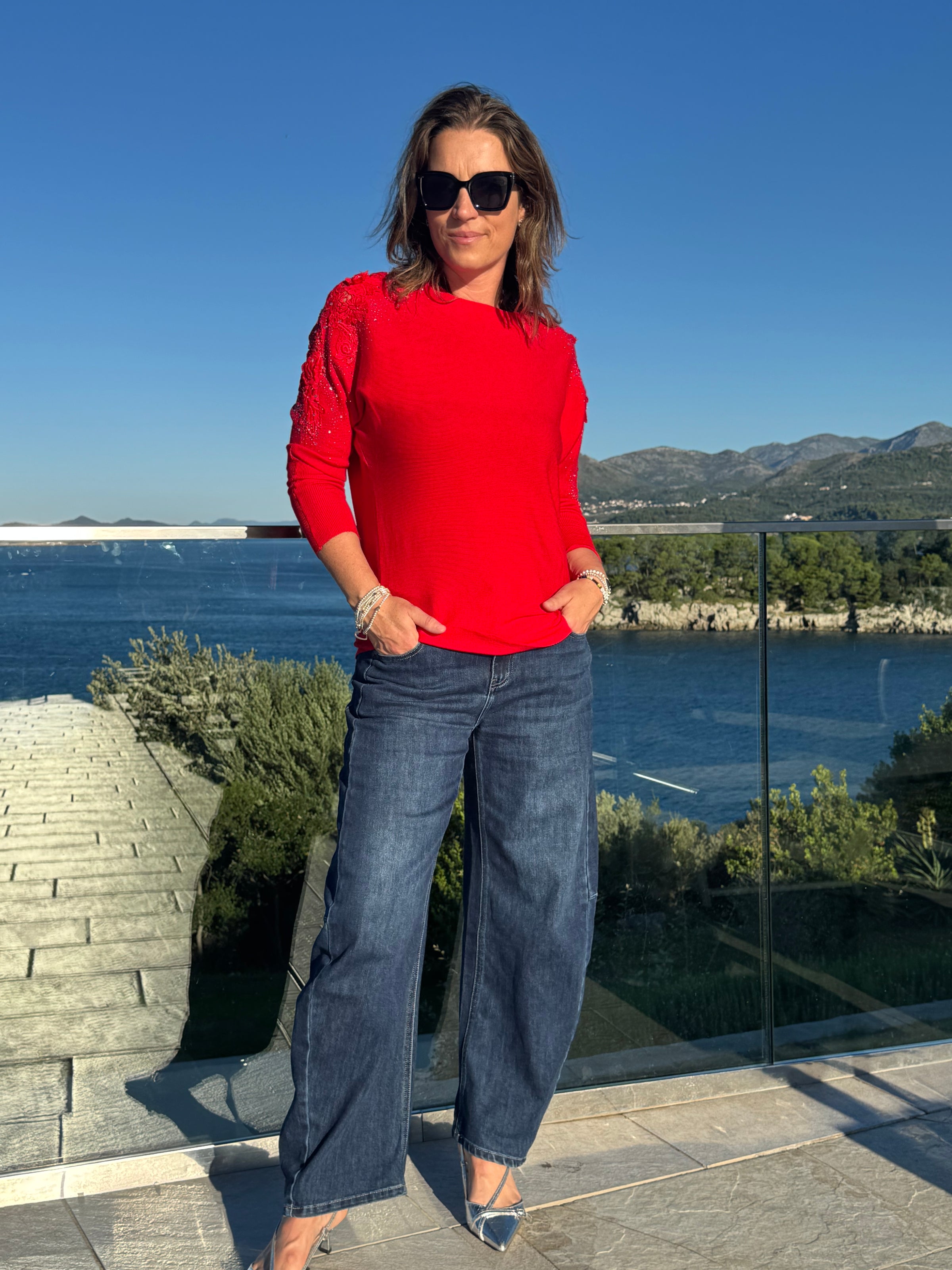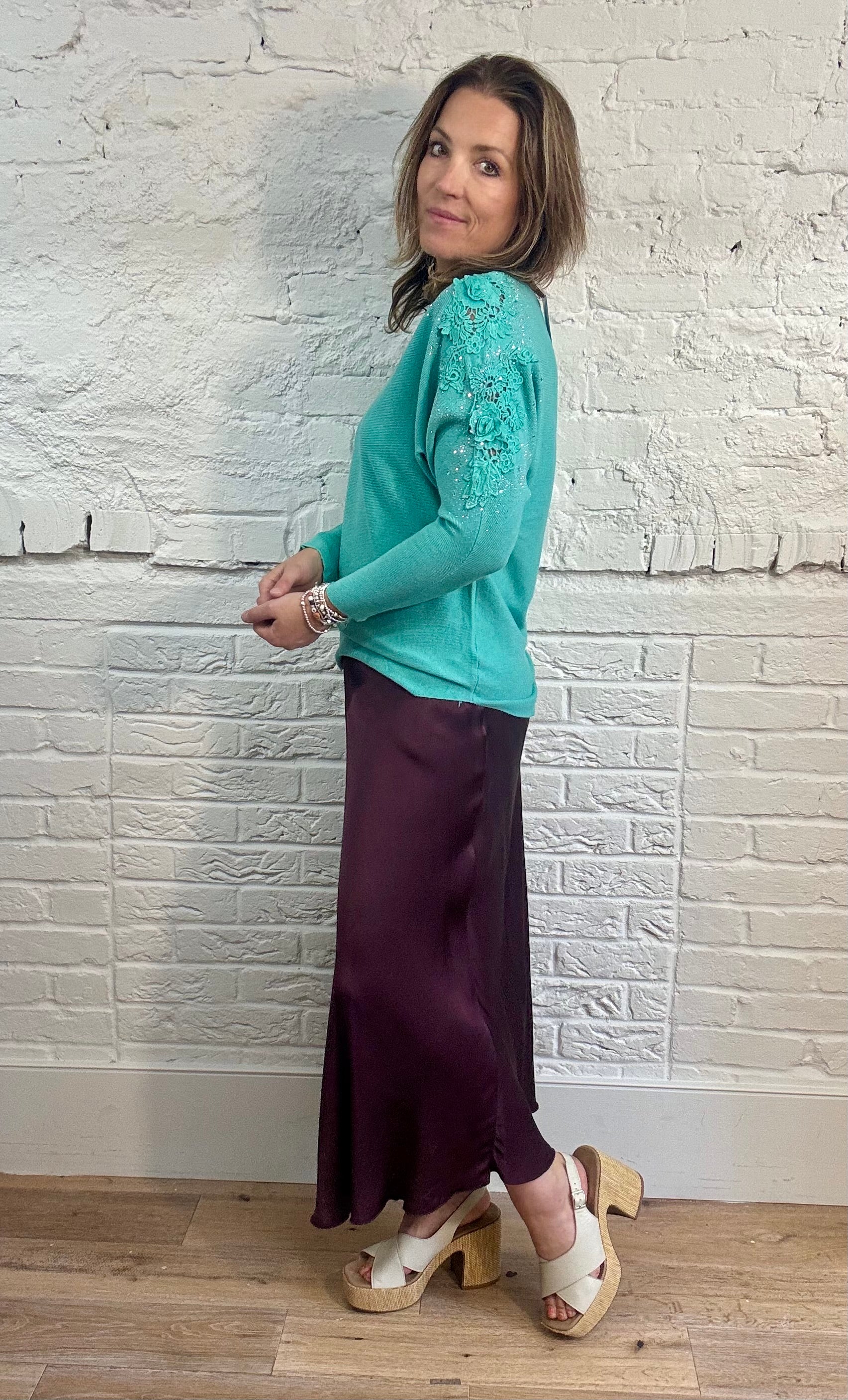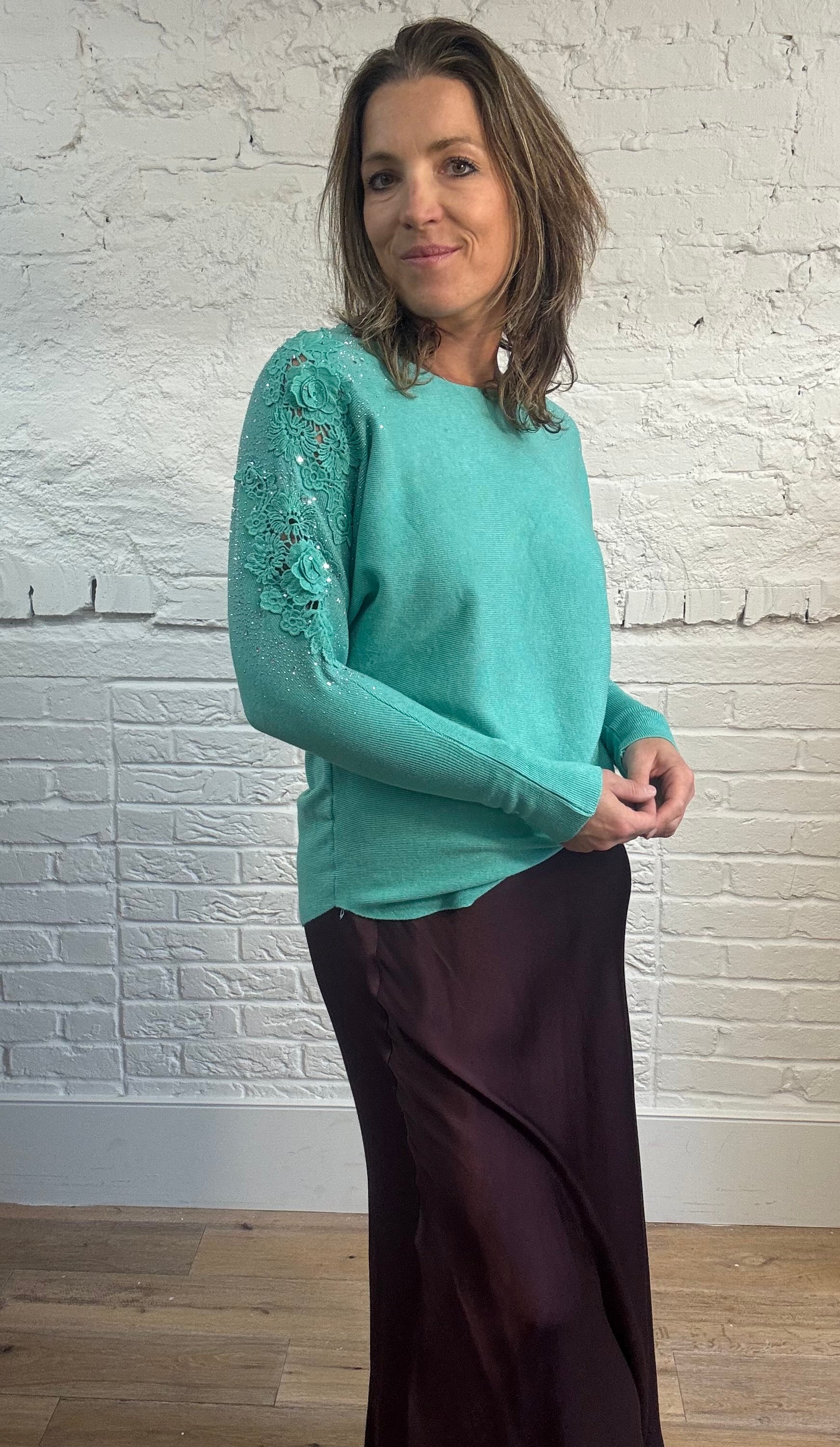 This elegant knit top features beautifully detailed floral lace embroidery on the shoulders, accented with shimmering embellishments that add a touch of sparkle. Designed with a round neckline and relaxed fit, it blends comfort with statement style, perfect for both casual chic and evening wear.