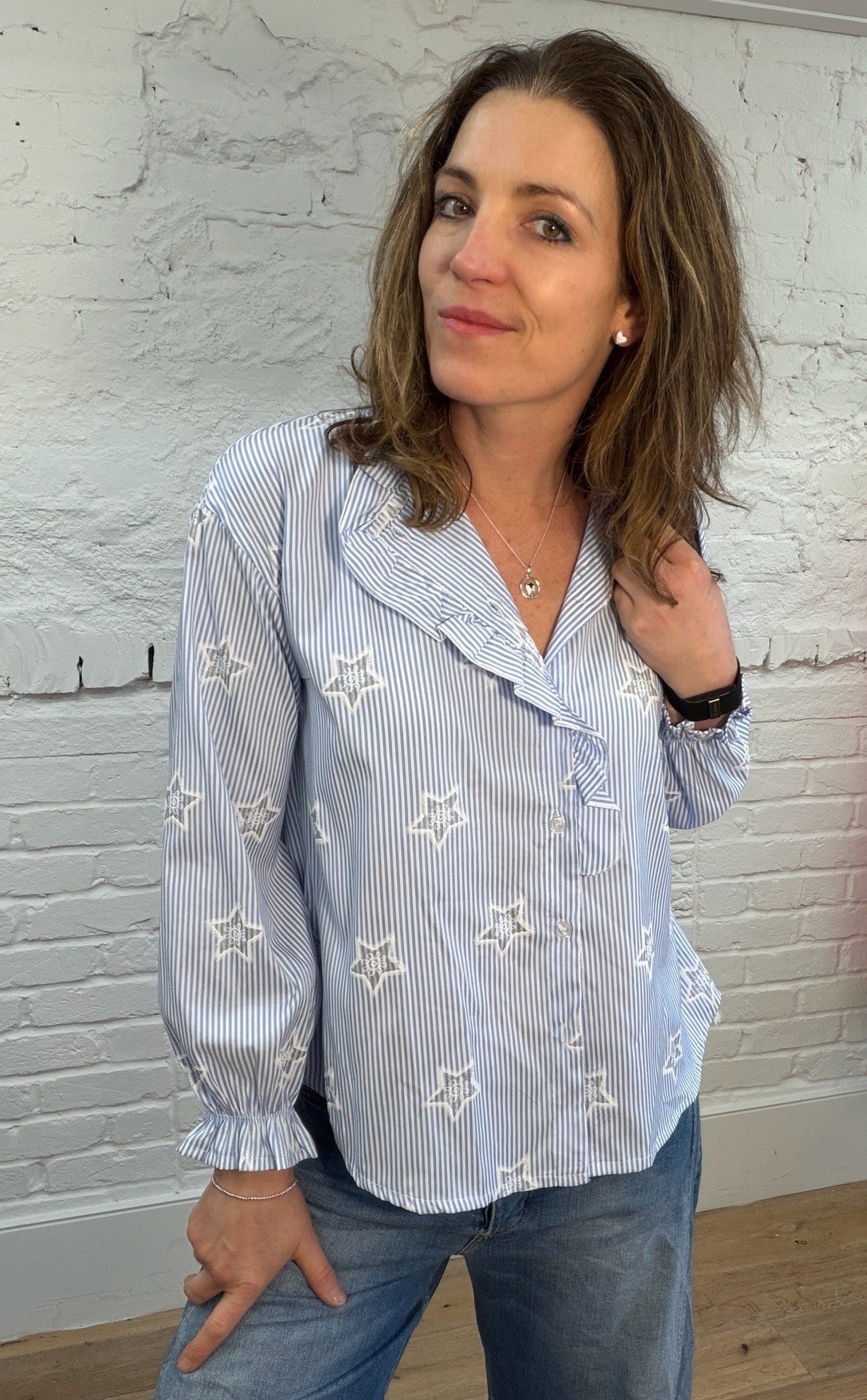This beautiful blue and white pinstripe blouse is sprinkled with embroidered stars for just the right touch of fun, Featuring a soft ruffled collar, front frill detail and gently gathered cuffs.
