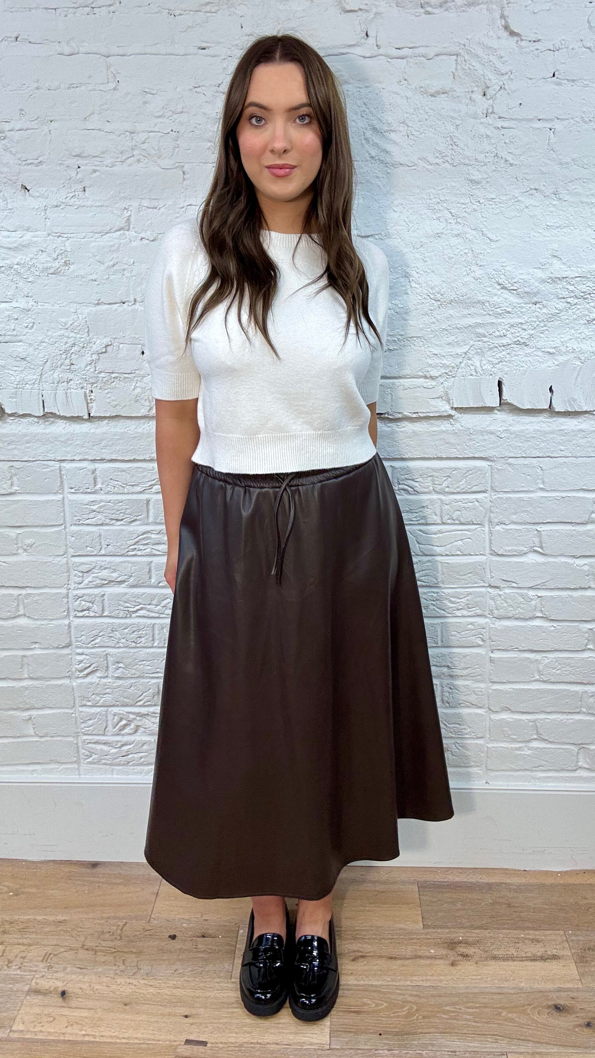 Crafted from soft, high-quality faux leather, this A-line skirt brings just the right amount of edge while keeping things wonderfully wearable. The gathered elastic waistband and adjustable tie ensure a comfortable, flattering fit, making it perfect for styling from day to night. Pair it with cosy knits, sharp tailoring, or your favourite boots for an instantly polished look.