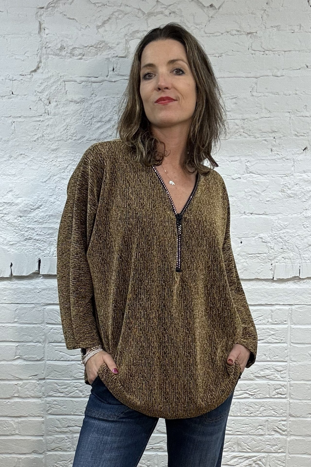 A fabulous zip V-neck top adorned with a sparkling diamante zip and a modern curved hem. The functional zipper lets you adjust the neckline to your preferred depth for both style and comfort. Made from a stretchy, lightweight, shimmering fabric that catches the light beautifully, this versatile piece moves effortlessly from day to night. Dress it up with statement jewellery and heels or keep it casual with jeans and trainers—perfect for any occasion.