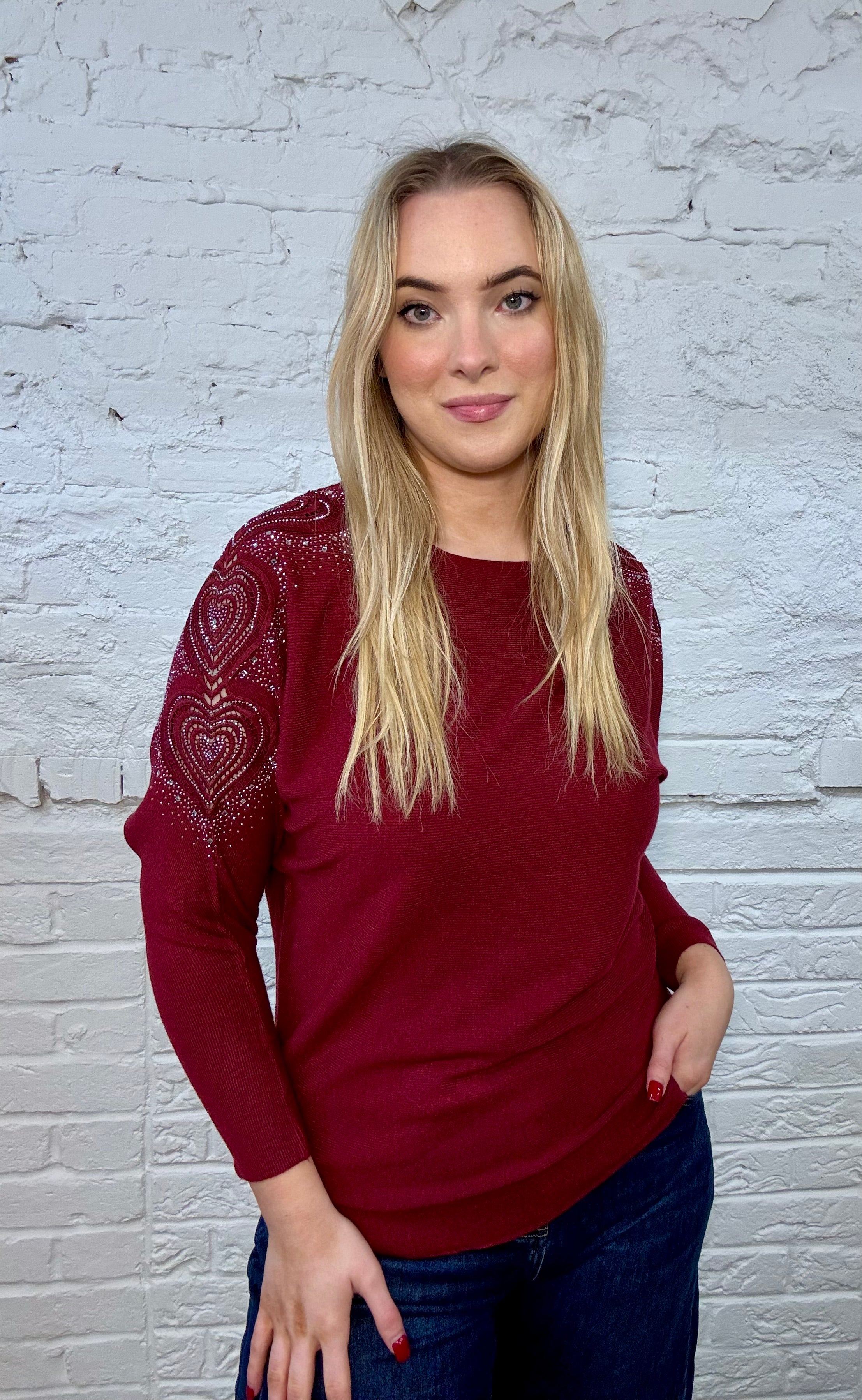 This elegant knit top features beautifully detailed Love Heart lace embroidery on the shoulders, accented with shimmering embellishments that add a touch of sparkle. Designed with a round neckline and relaxed fit, it blends comfort with statement style, perfect for both casual chic and evening wear.
