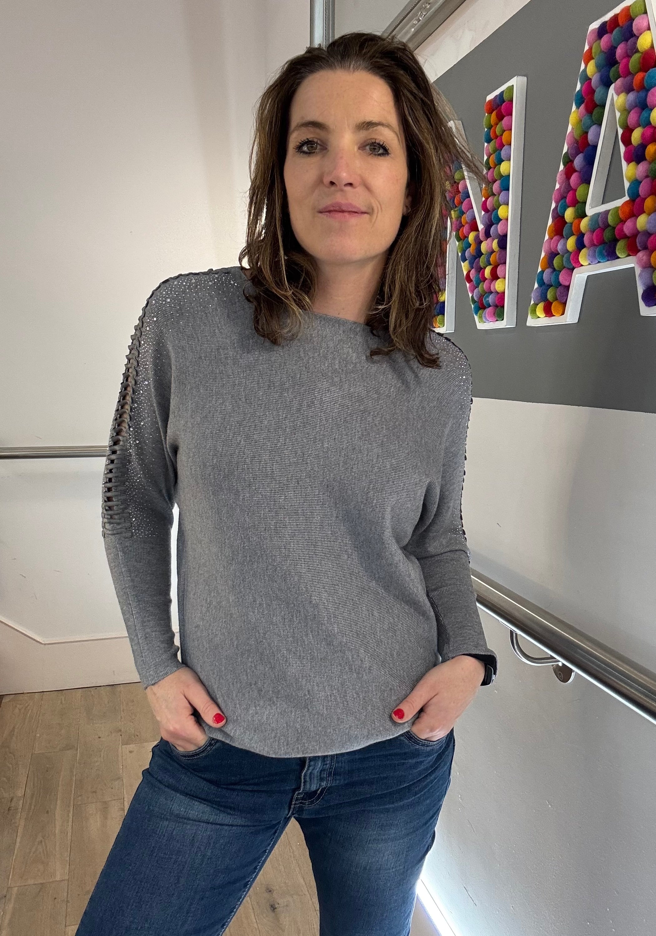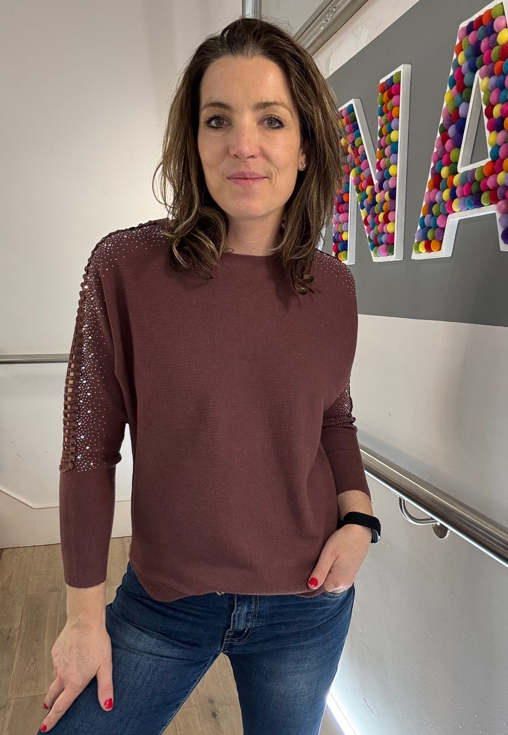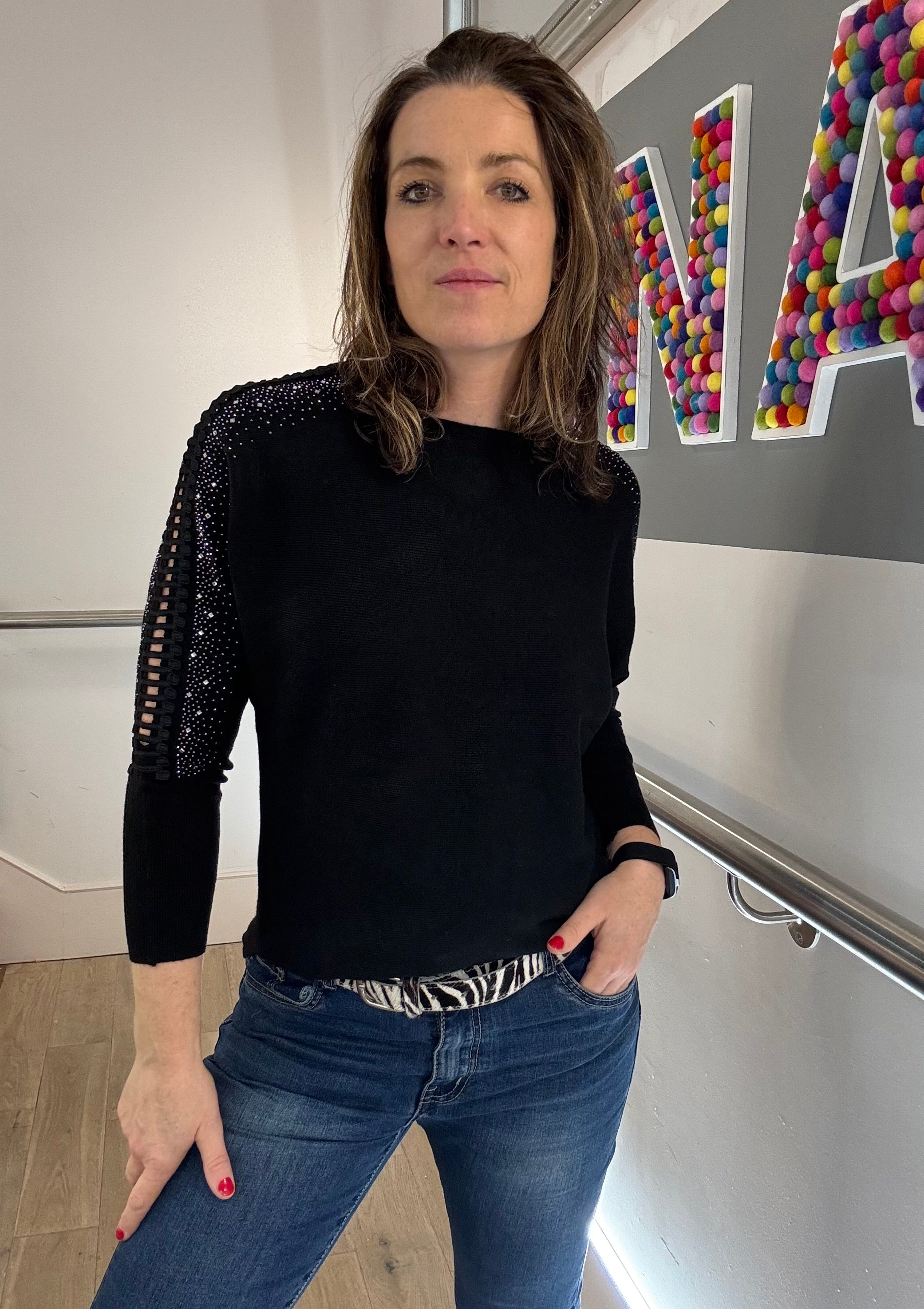 This elegant knit top features beautifully detailed ladder detail on the sleeve, accented with shimmering embellishments that add a touch of sparkle. Designed with a round neckline and relaxed fit, it blends comfort with statement style, perfect for both casual chic and evening wear.