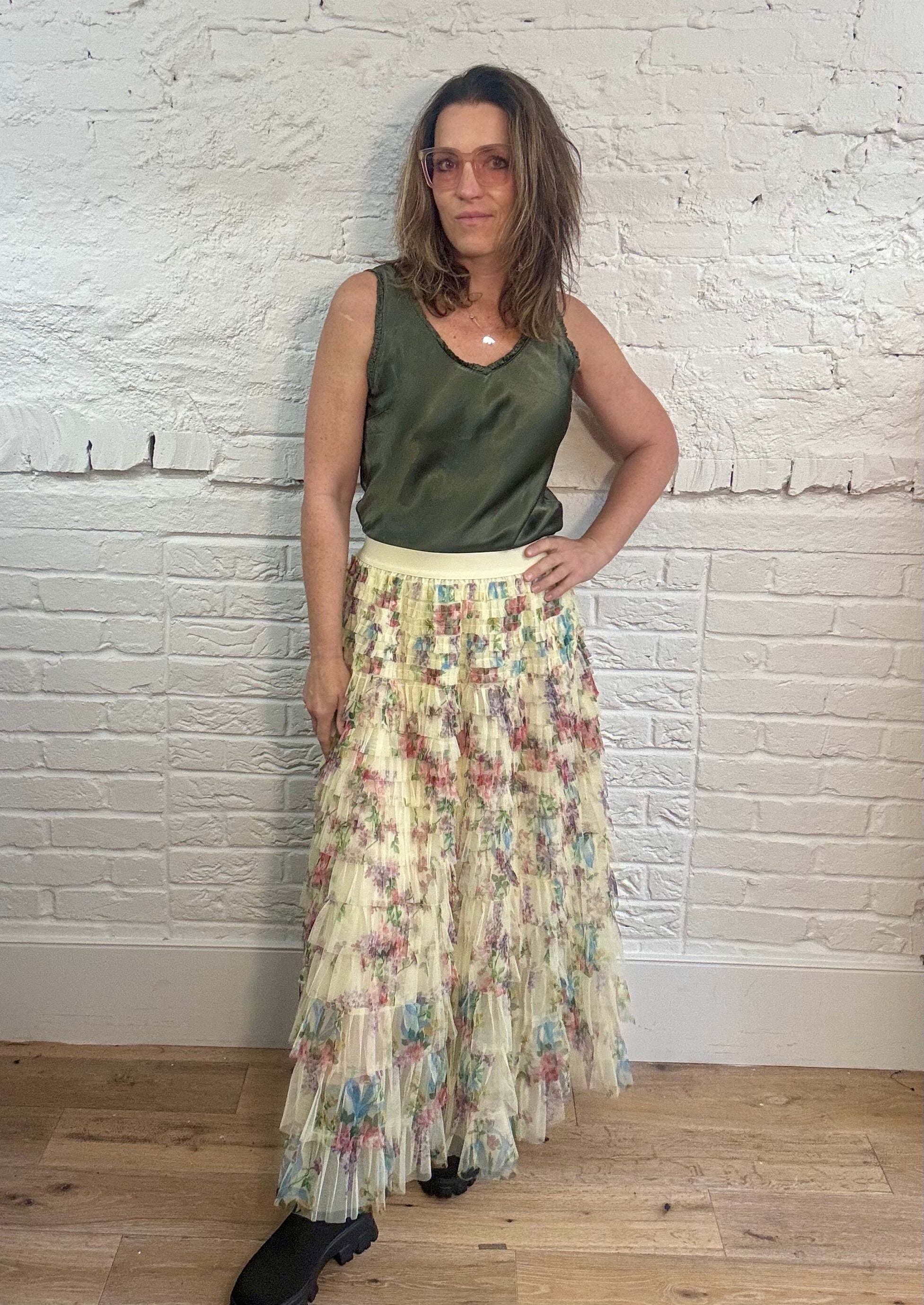 Twirl into style with this flirty tulle, tiered ruffle maxi skirt, covered in a lively floral print. The flowy layered design adds plenty of movement, while the comfy elastic waistband keeps it easy to wear all day. Dress it up with heels and a blouse or keep it casual with trainers and a tee—this skirt is ready for wherever the day takes you!