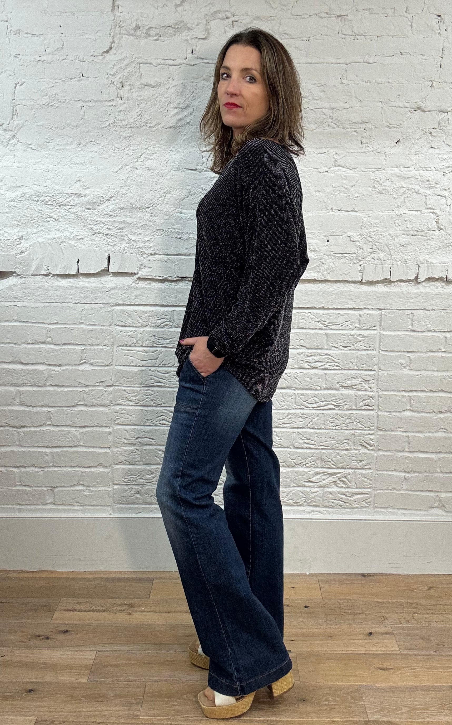 Fabulous zip v-neck top featuring stunning diamante zip detail and a contemporary curved hem. The functional zip allows you to customise the neckline depth to suit your style and comfort. Crafted from a beautiful stretchy lightweight shimmering fabric that catches the light beautifully. This versatile piece effortlessly transitions from day to night, making it perfect to dress up with statement jewelry and heels or keep casual with jeans and trainers for any occasion.