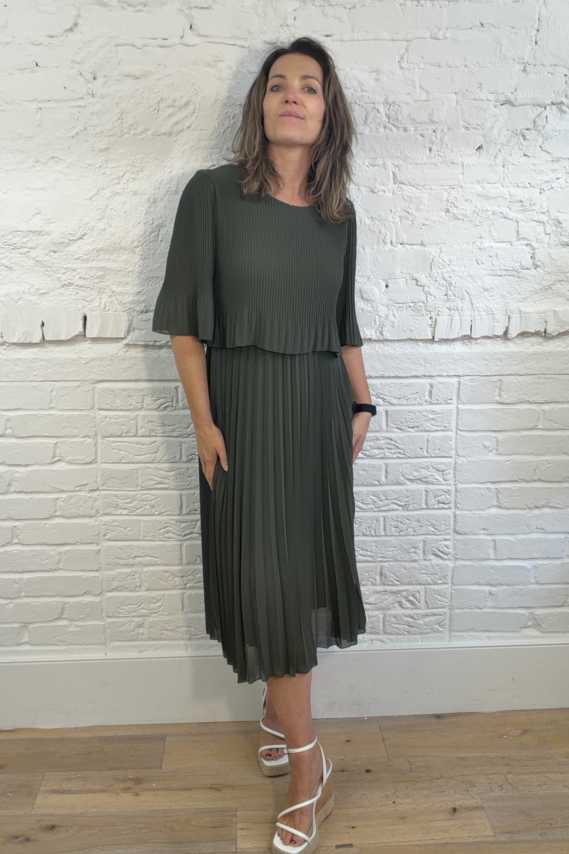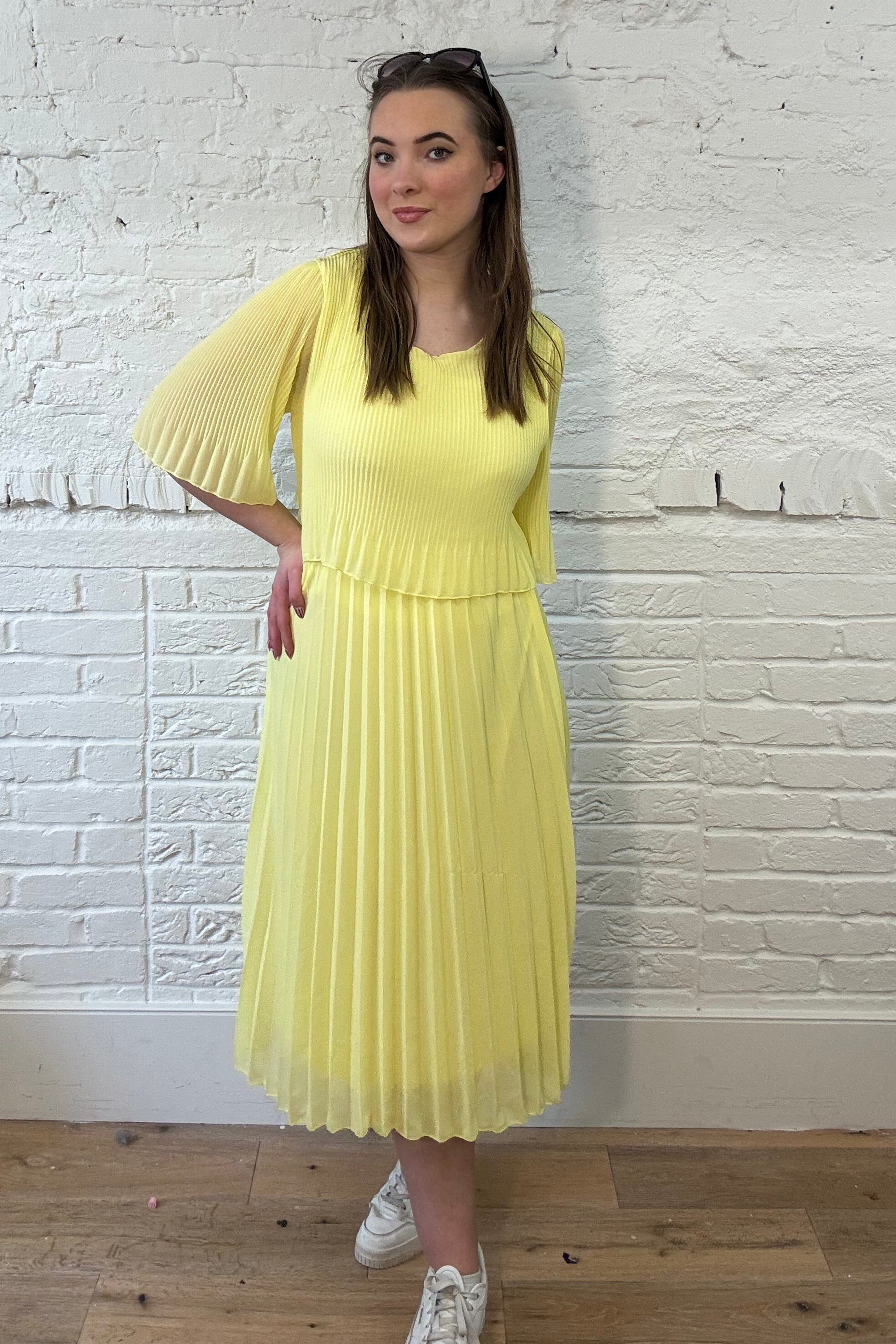 Float through your day in this effortlessly elegant chiffon dress. With soft, delicate pleats that move beautifully with every step, this piece is all about flattering your silhouette while keeping things light and breezy. It features a classic round neckline, easy short sleeves, and a fully lined finish for that extra touch of comfort. The layered bodice adds a modern twist, giving it just the right amount of chic detail.