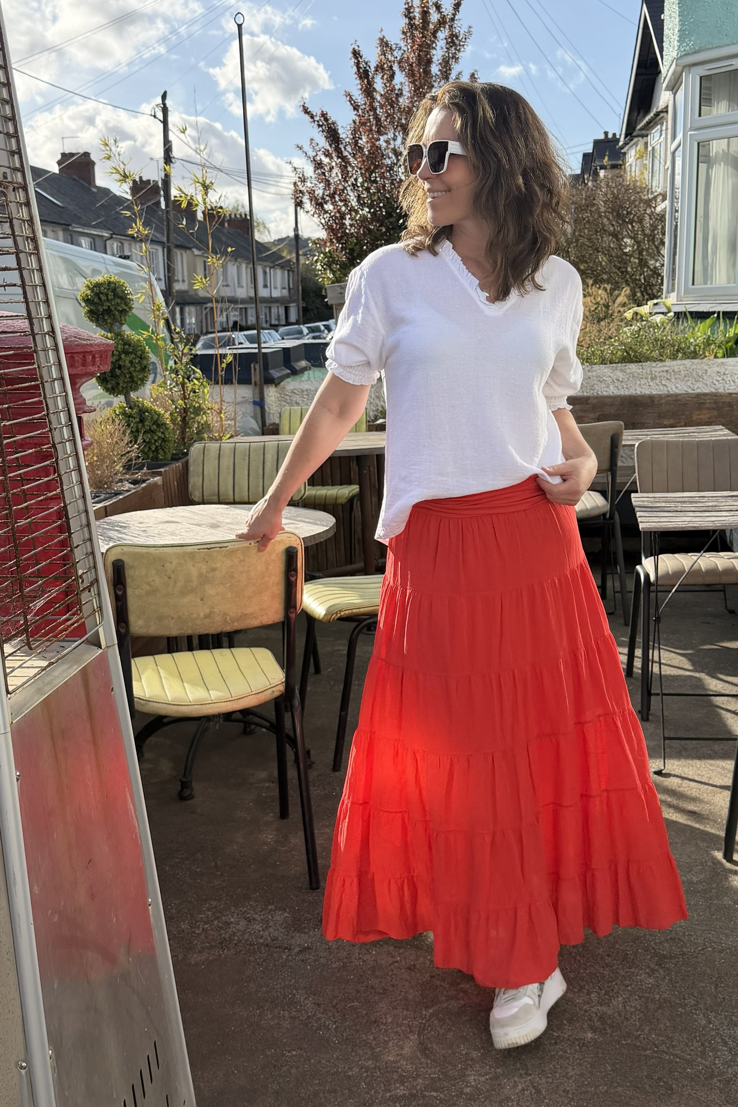 Falda 100 % algodón con cintura lisa, gruesa y cómoda, que ofrece estilo y comodidad. Su ligereza y sensación de amplitud se complementan con un diseño escalonado.