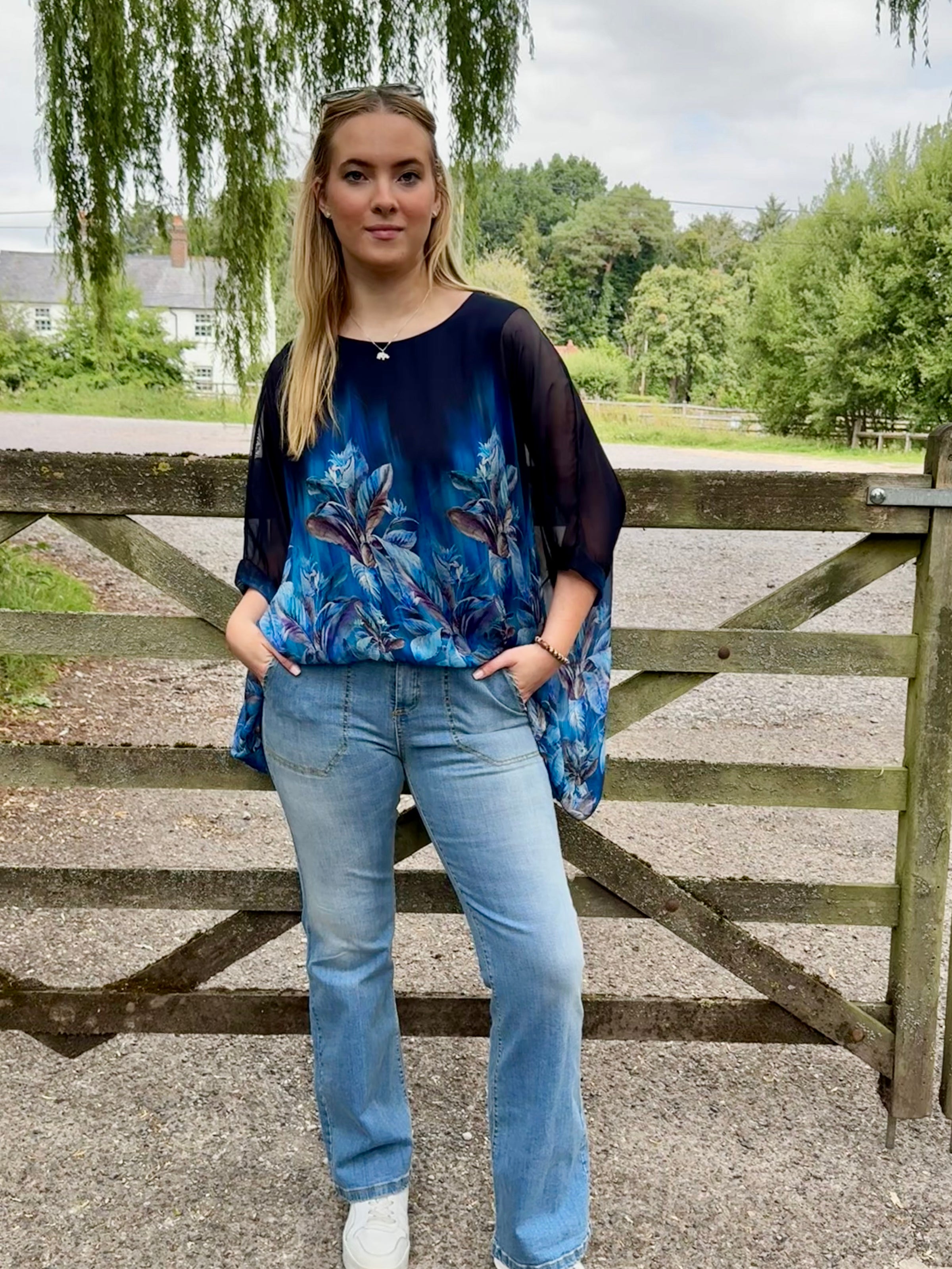 A luxurious silk top with an eye-catching botanical print that flows with every movement. Designed with a relaxed silhouette and soft batwing sleeves, this piece offers effortless elegance and comfort. The jersey underlay is ultra soft and comfortable against the skin and provides coverage under the sheer overlay. Ideal for both daytime ease and evening refinement. Lightweight and breathable, it's perfect for travel, layering, or elevating a simple look with graceful sophistication.