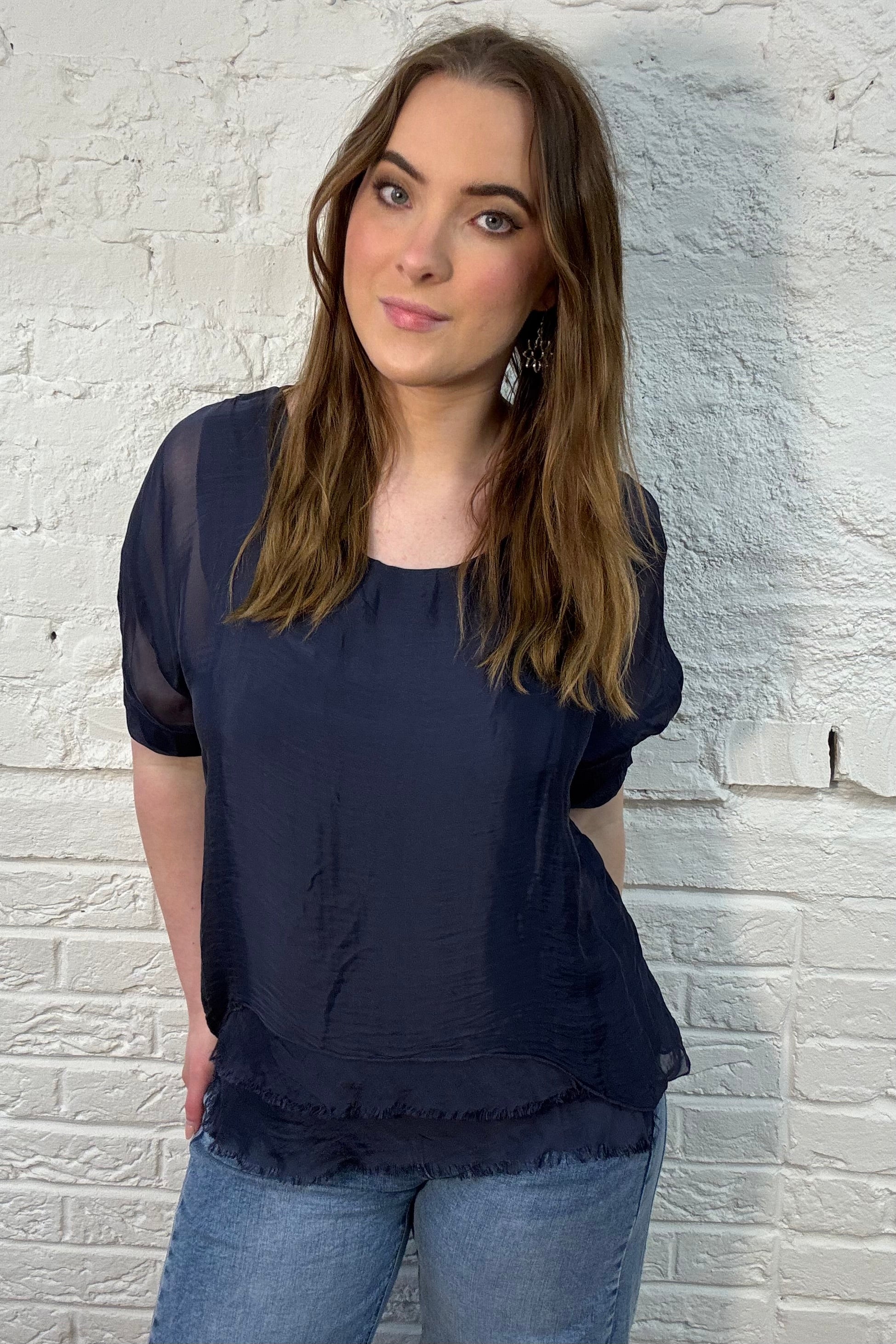 ¡Esta blusa fresca es tu opción ideal para una divertida salida nocturna! Con lindas mangas hasta el codo, un toque de transparencias y un divertido dobladillo en capas, tiene la dosis justa de feminidad. El forro de viscosa suave como la mantequilla garantiza que estarás cómoda y elegante todo el día. ¡Combínala con tus pantalones favoritos, agrega algunos accesorios divertidos y estarás lista para salir a la noche con estilo!