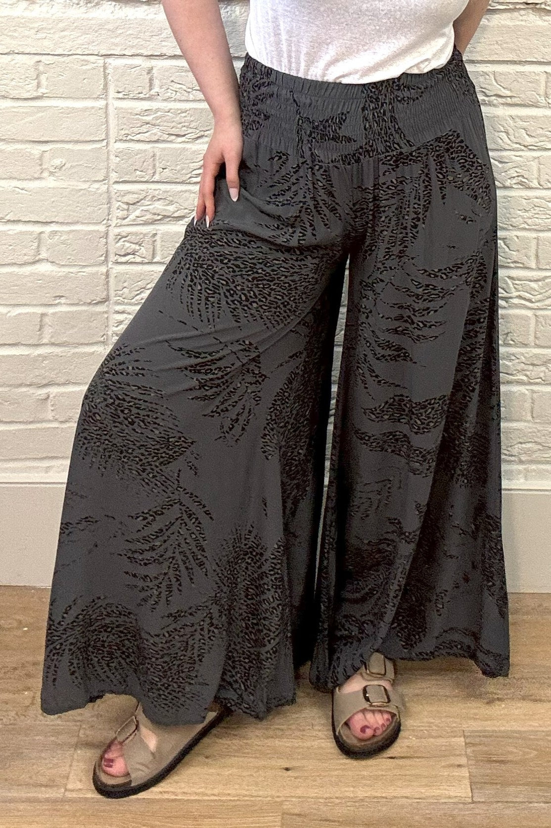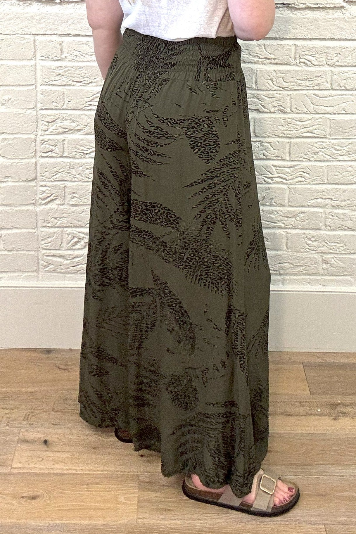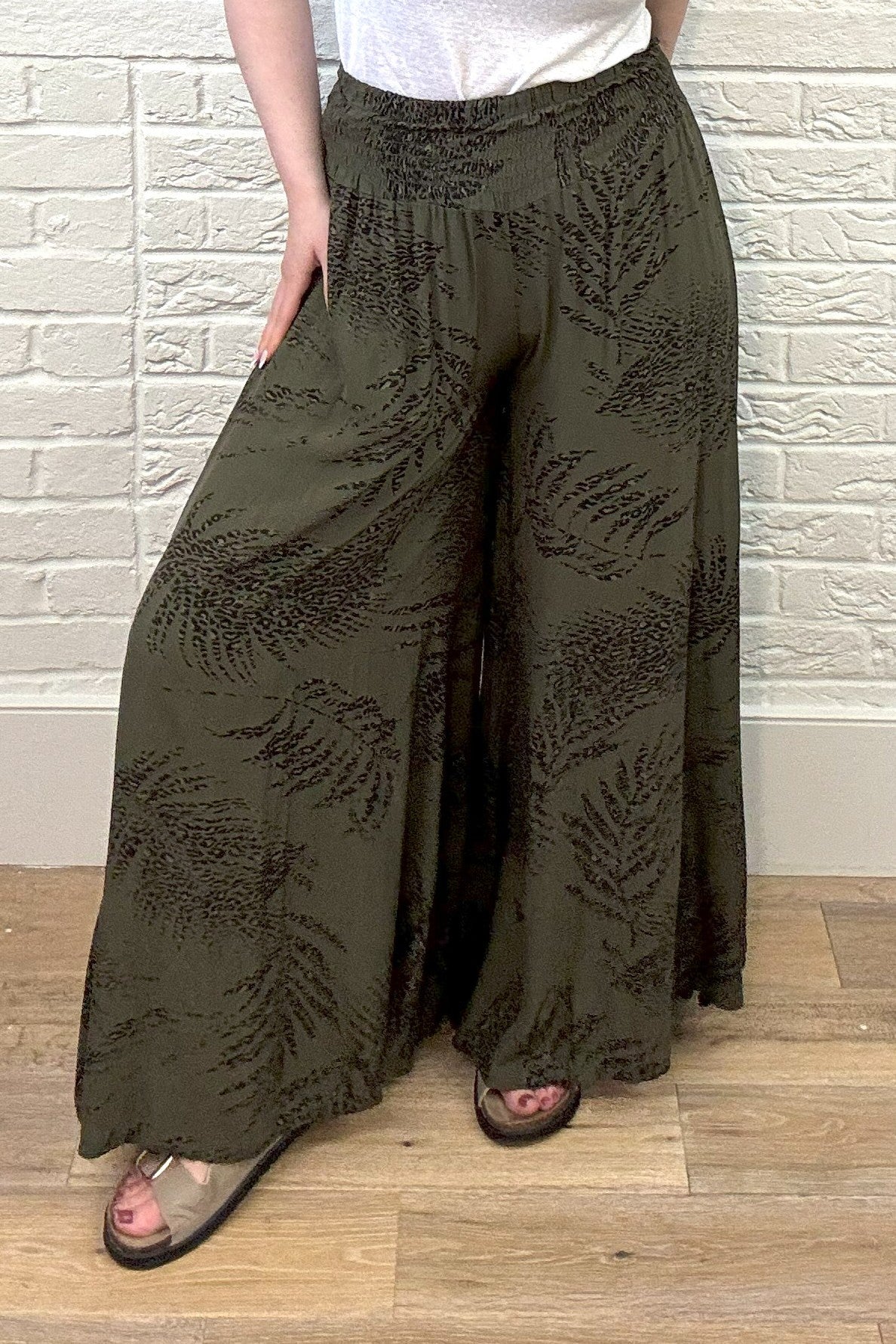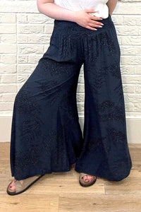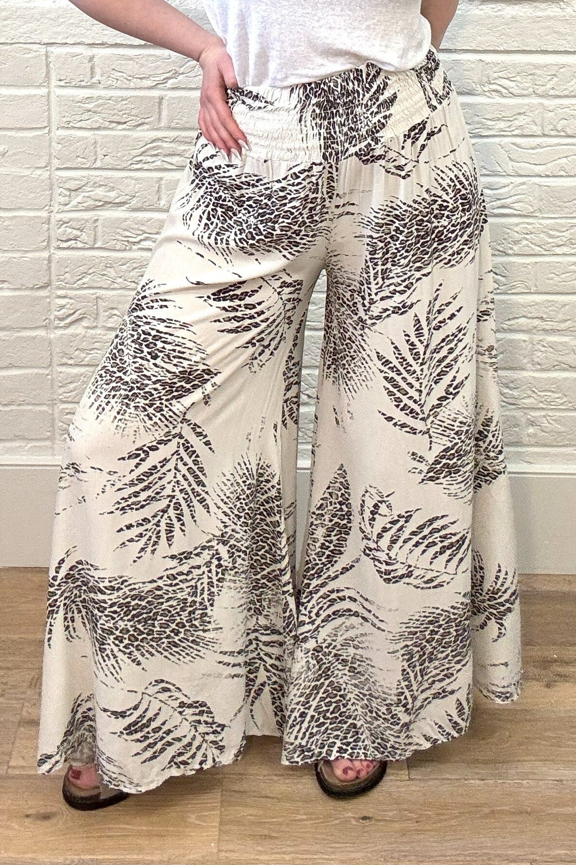 Be effortlessly stylish and comfortable in our Leaf Print Wide Leg Trouser. Perfect for long days, lunch with friends or just lounging, these lightweight trousers have a wide shirred waistband for maximum comfort. Your go-to choice for any occasion!