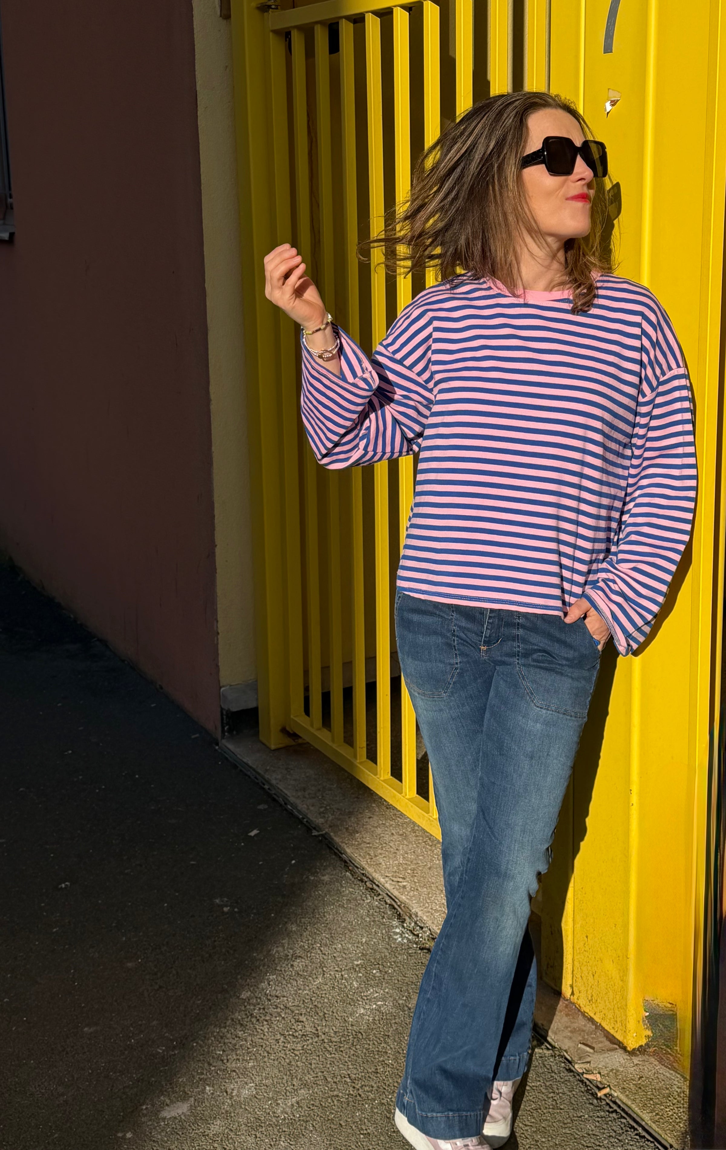 The classic stripe keeps this things timeless, while the wide sleeves adds a modern, laid-back feel. Soft breathable fabric makes it ideal for layering or wearing solo for comfort while still looking stylish. It pairs just as effortlessly with denim as it does tailored trousers or joggers.